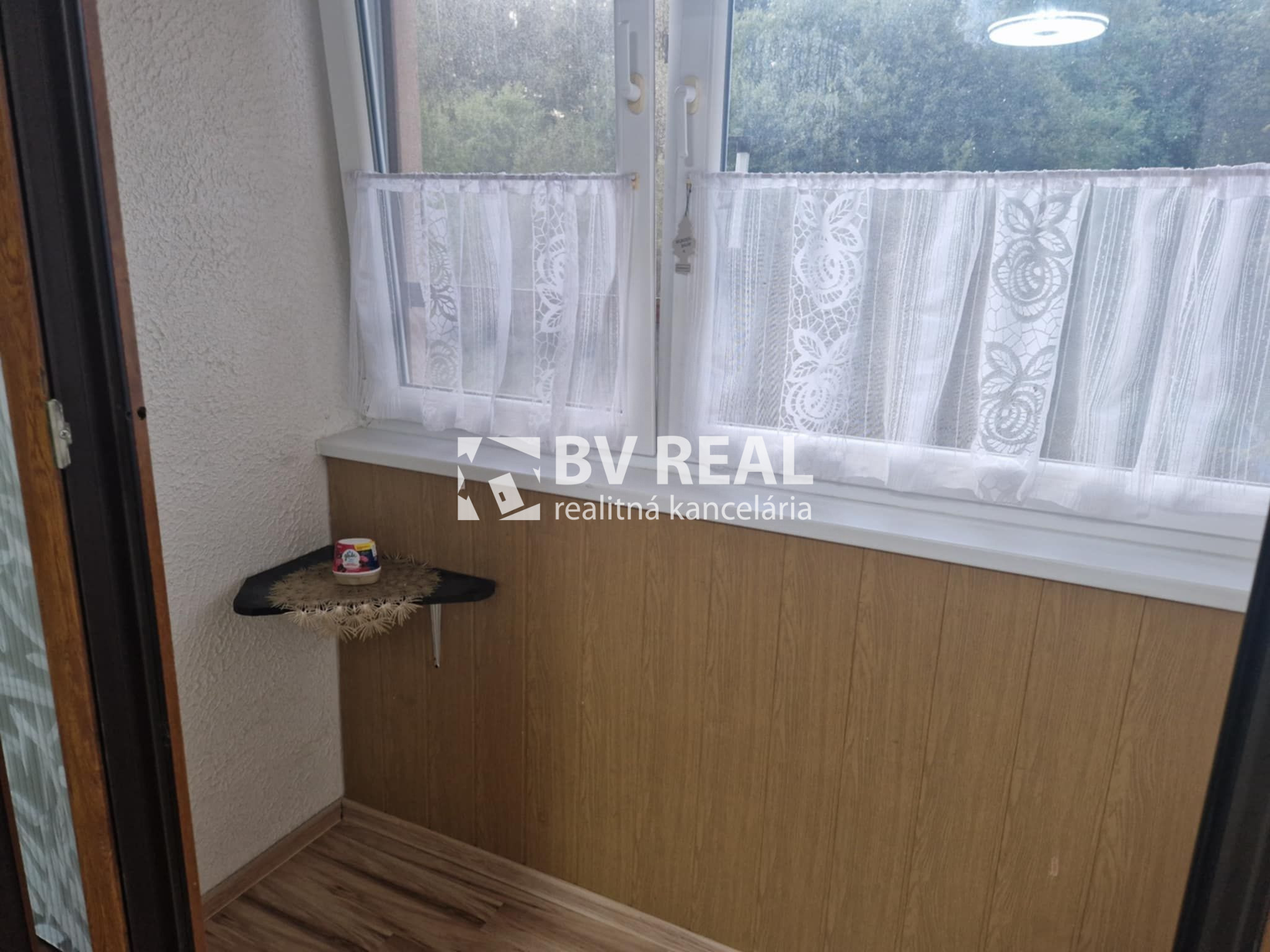 Byt má aj priestrannú loggiu s uzatvorením zasúvacími dverami a plastovými oknami, s dreveným obkladom a poličkami, z ktorej je výhľad na prírodu a detské ihrisko.