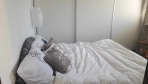 V izbe je manželská posteľ, vstavaná skriňa.