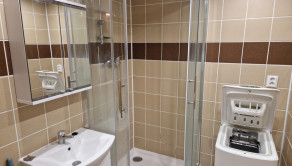 V kúpelni je sprchový kút, umývadlo, priestor na práčku, obklad, dlažba.