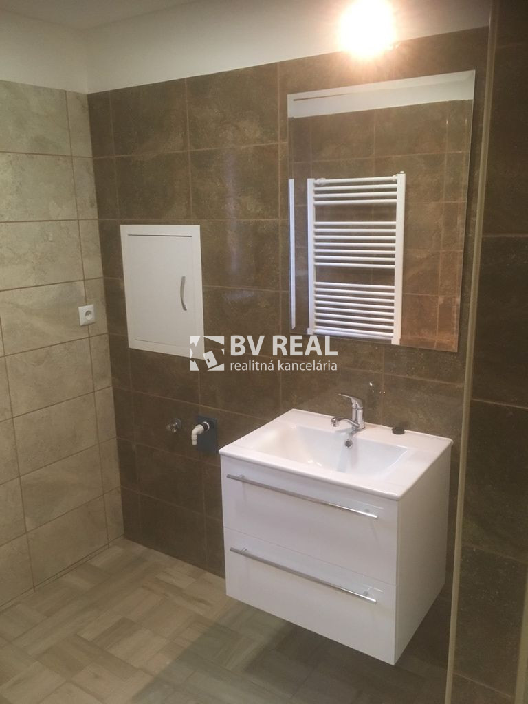 Murované bytové jadro, kde sa nachádza kúpeľňa so sprchovým kútom, umývadlom s kúpeľňovým nábytkom, priestor na práčku, s novými dlažbami a obkladmi.