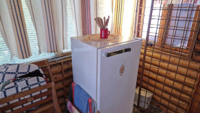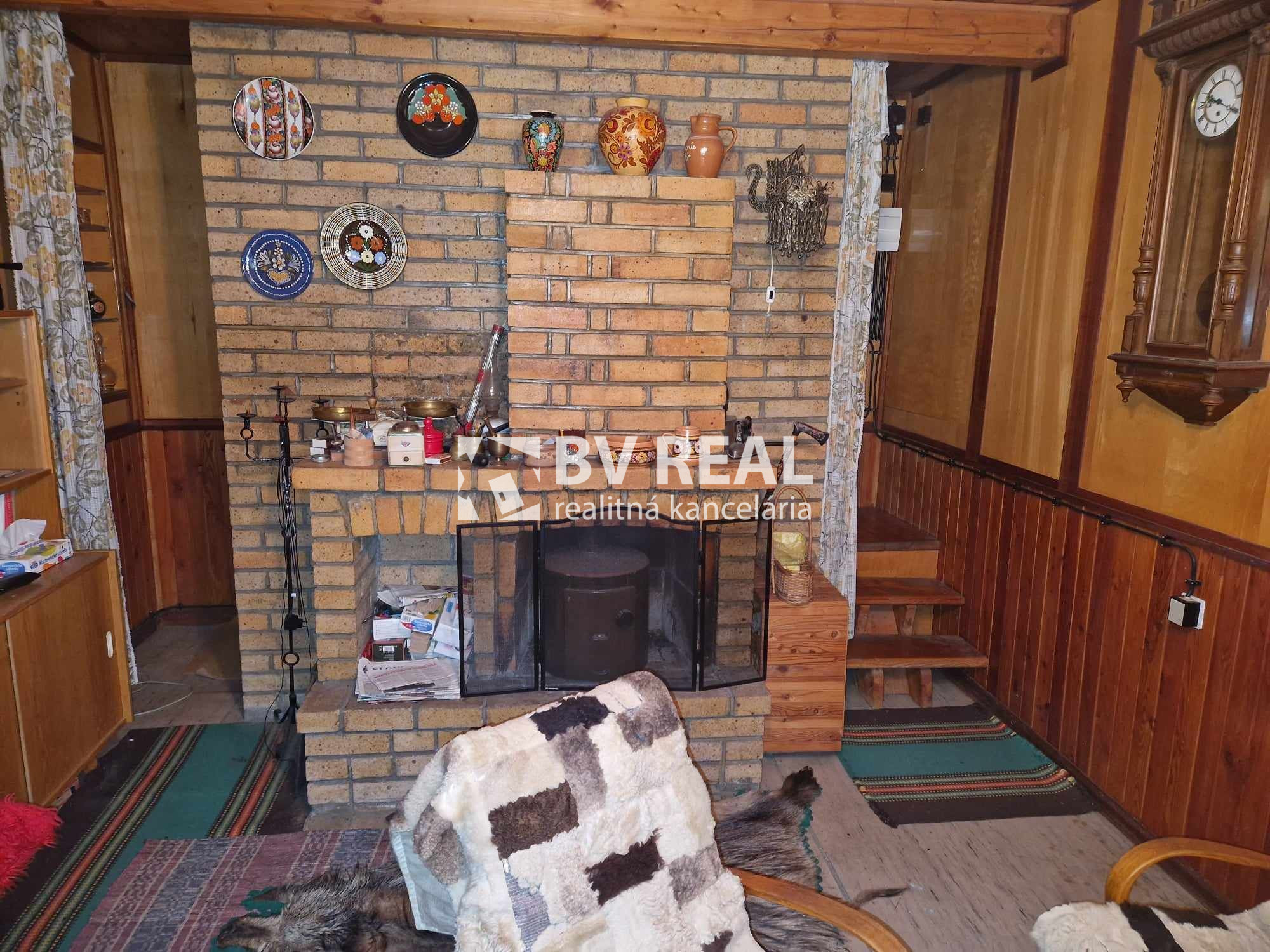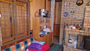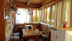 Na prízemí je vstupná miestnosť s válendou, kreslom a chemickým WC a umývadlom, ďaľšia miestnosť s jedálenským posedením, chladničkou a mikrovlnkou, ďalej sa tam nachádza obývačka s krbom s prieduchmi aj do podkrovia s možnosťou údenia klobások, gaučom, kredencom, lavicou, kreslami a stolom a za krbom je skladový priestor s kuchynkou.