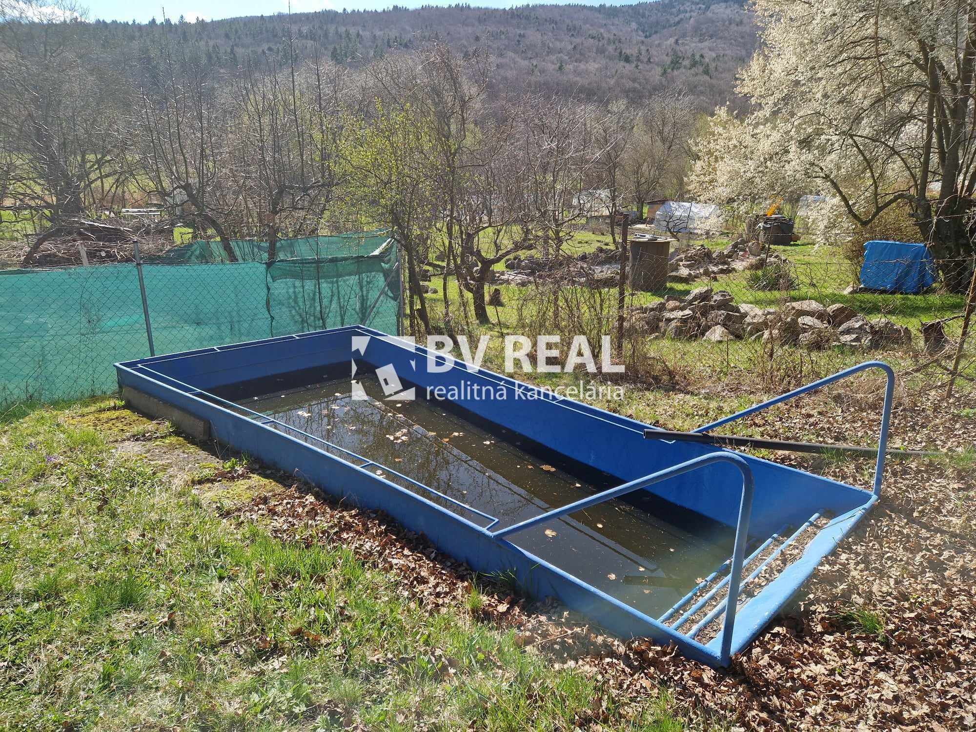 Na pozemku je aj bazén, veľký sad s ovocnými stromami rôznych odrôd ako sú jablone, slivky, hrušky, priestor na sadenie, kompostér, tuje, nádrž na vodu napájanou z centrálnej studne spoločnej aj pre susedov s polievaním so samospádom, ďalšia studňa, za chatkou je priestor na uskladnenie náradia.