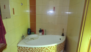 V kúpeľni je obložená rohová vaňa, umývadlo, zrkadlo, priestor na práčku, obklad a dlažba.