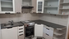 V priestrannej kuchyni na mieru rohová kuchynská linka, s nerezovým dresom, sporákom a digestorom, obklad a dlažba.