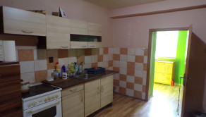 V kuchyni je kuchynská linka s nerezovým dresom, so sporákom so sklokeramickou varnou doskou, obklad na dvoch stenách, stôl so stoličkou, skrinka, válenda.