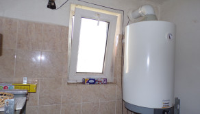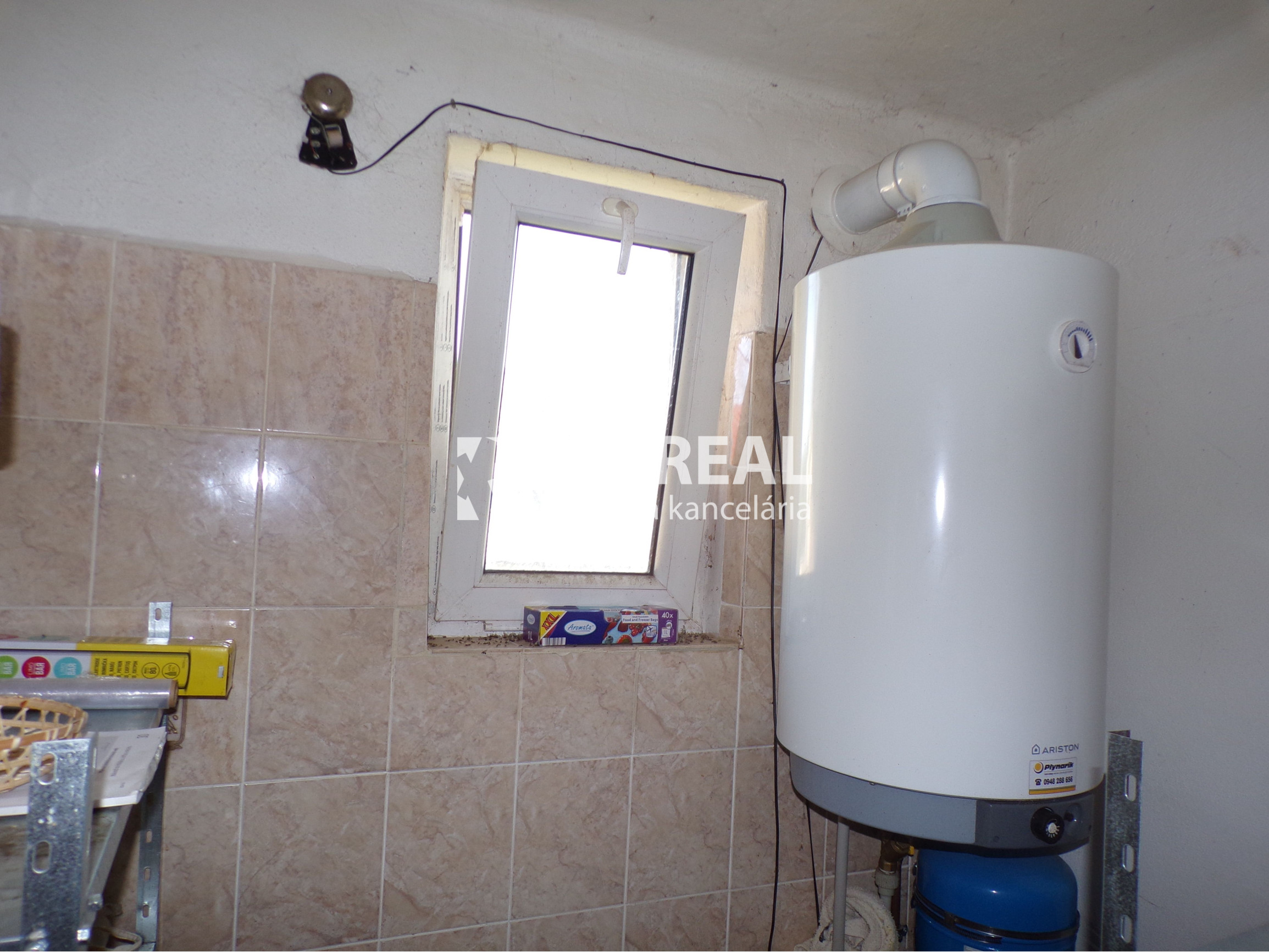 Pri kuchyni je aj špajza s poličkami, obklad na stenách, dlažba a nachádza sa tam bojler na teplú vodu.