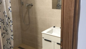 Murované bytové jadro, kde je kúpeľňa, sprchový kút, umývadlo s kúpeľňovým nábytkom, priestor na práčku, podsvietené zrkadlo, dlažby, obklad.