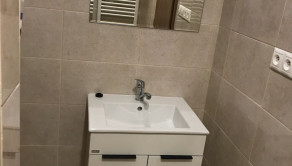 Murované bytové jadro, kde sa nachádza kúpeľňa so sprchovým kútom, umývadlo s kúpeľňovým nábytkom, priestor na práčku, podsvietené zrkadlo, dlažby, obklad.