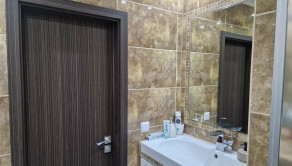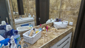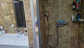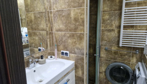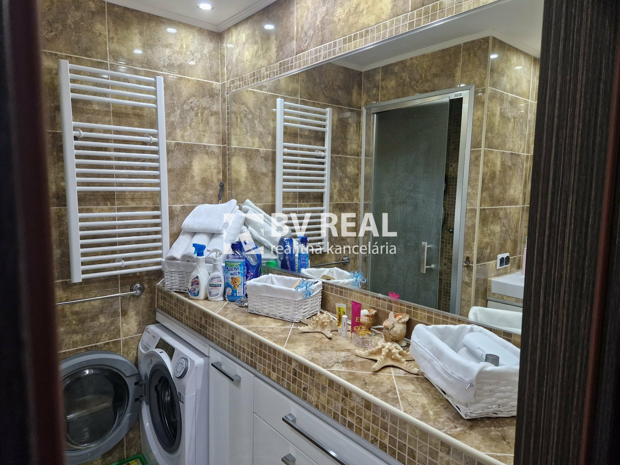 Murované jadro s kúpeľňou, sprchový kút, vyvýšené umývadlo, priestor na práčku, vymurované poličky, kúpeľňový nábytok, obklad, dlažba.