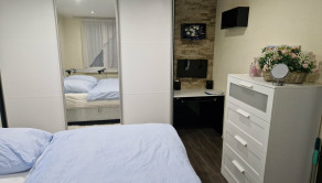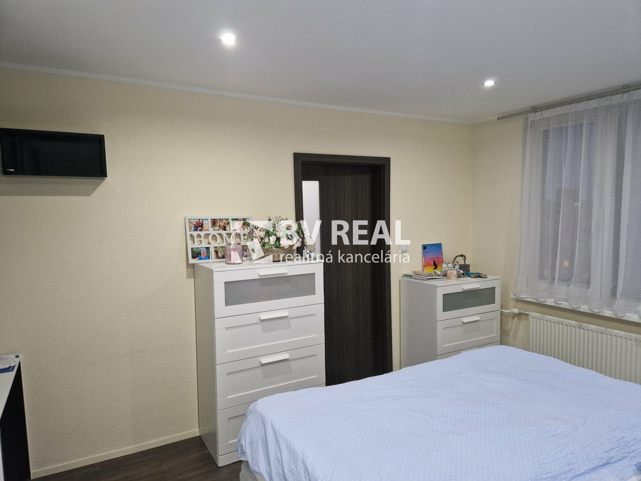 V spálni je vstavaná skriňa, komody, pracovný stôl, TV, manželská posteľ, dlažba.