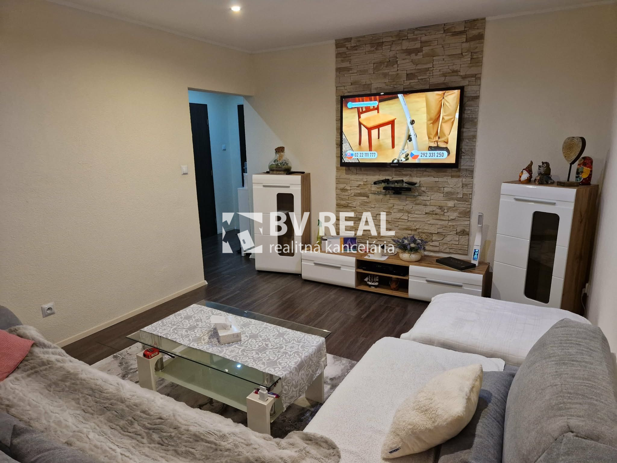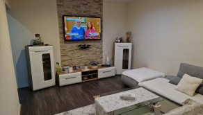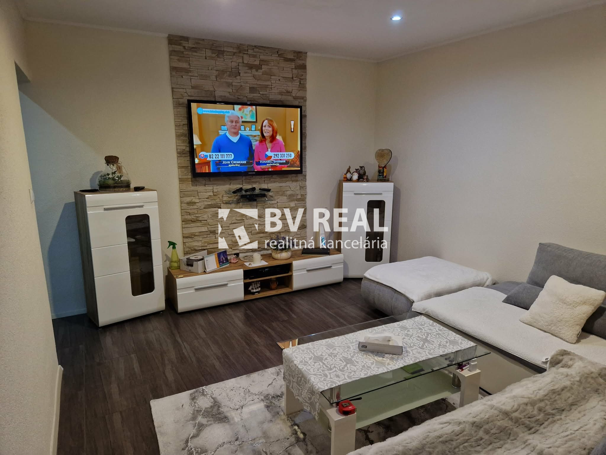 V obývačke je obývacia stena, rohový gauč, stôl, obklad na stene, TV na stene, dlažba.