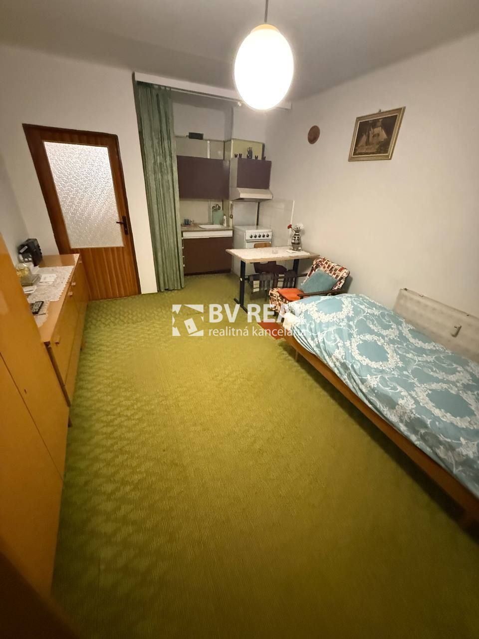 V jednej izbe spojenej s kuchyňou aj s balkónom sa nachádza aj posteľ, kreslo, obyvačková zostava z TV, stôl, stoličky.