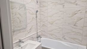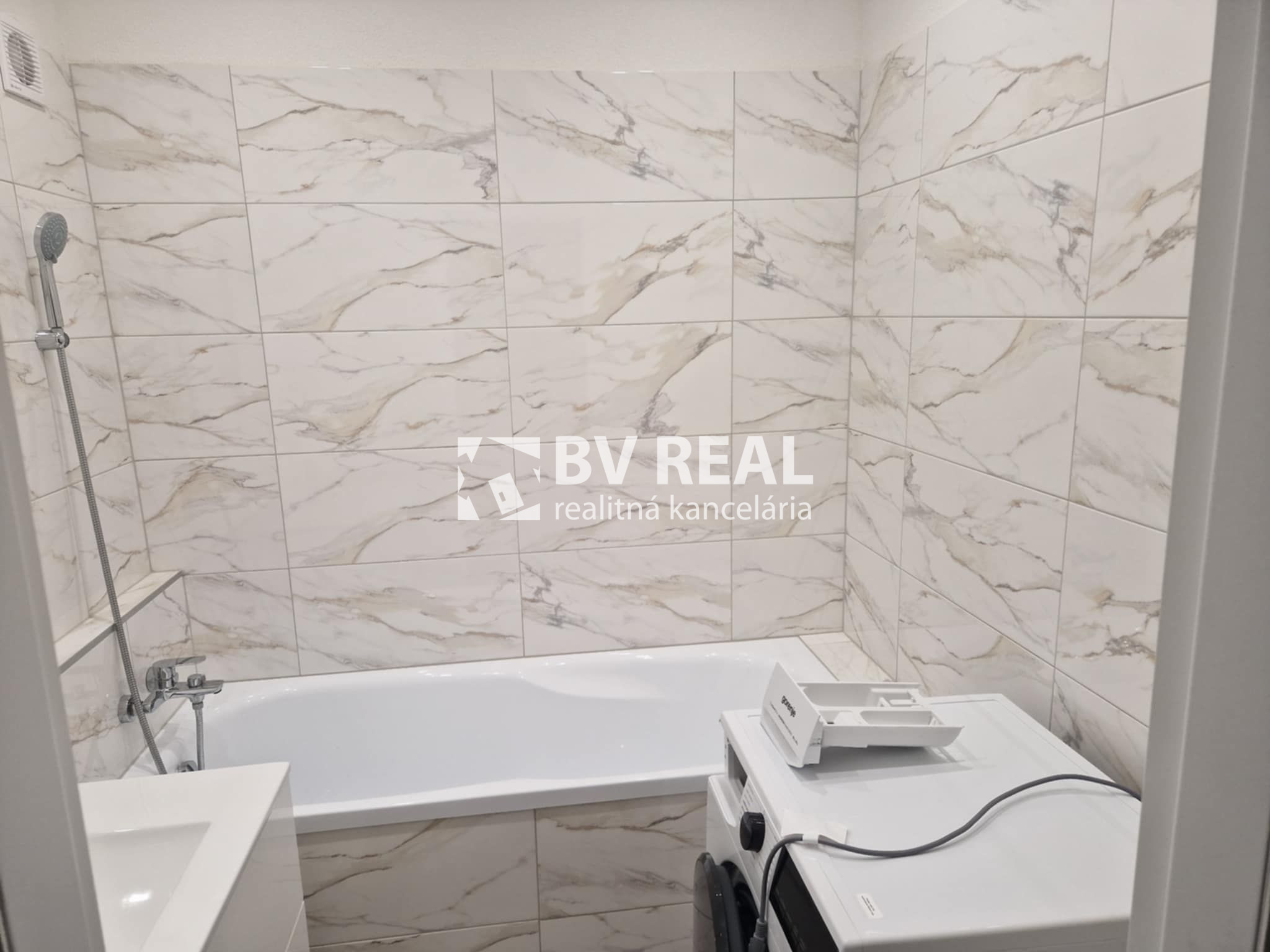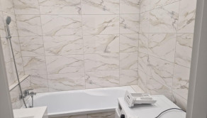 V murovanom jadre je vaňa s okladom, znížený strop sádrokartónom, umývadlo s kúpeľňovým nábytkom, práčka.