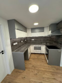 V kuchyni nová na mieru urobená rohová kuchynská linka s dresom, so zabudovateľnou varnou doskou a zabudovateľnou rúrou, digestor, obklad, plávajúca podlaha, znižovaný strop.