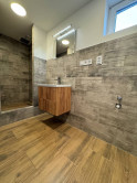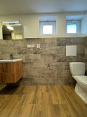 V murovanom bytovom jadre je sprchový kút, umývadlo, dlažby, obklad, zrkadlo s podsvietením, priestor na práčko, WC.