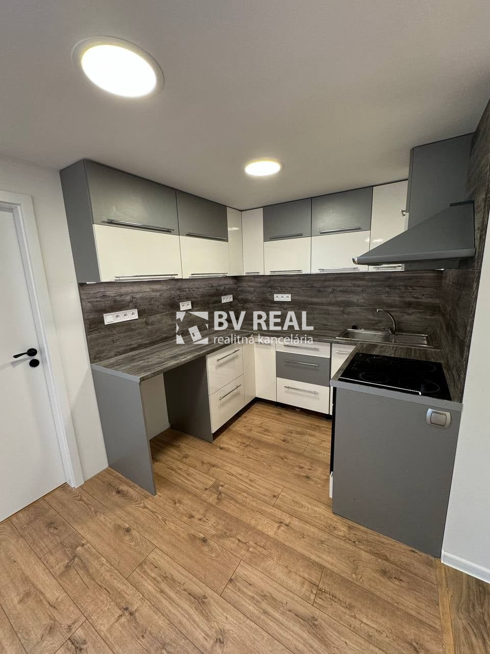 V kuchyni na mieru urobená rohová kuchynská linka s dresom, vstavaná varná doska a rúrou, digestor, obklad, plávajúca podlaha, znižovaný strop.