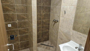 Murované bytové jadro, kde je kúpeľňa so sprchovým kútom, umývadlo, kúpeľňový nábytok a zrkadlo, dlažby, obklad.