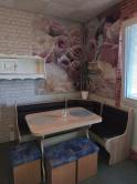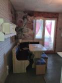 V kuchyni je rohová kuchynská linka s nerezovým dresom, obklad, rohová lavica, stôl, balkón.
