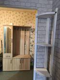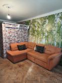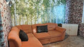 V obývačke je rohový gauč, skriňa, skrinka.