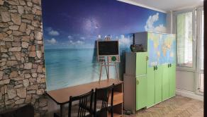 V spálni je poschodová posteľ, písací stôl, skrinky, válenda, ďalší balkón.
