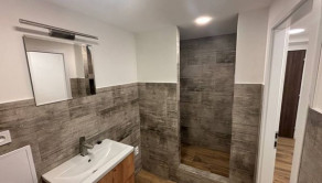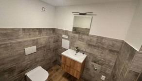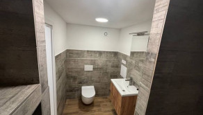 Murované bytové jadro, kde je kúpeľňa, sprchový kút, umývadlo, kúpeľňový nábytok, podsvietené zrkadlo, priestor na práčku, dlažby, obklad, WC s geberitom.