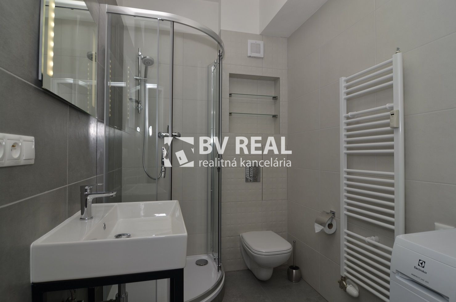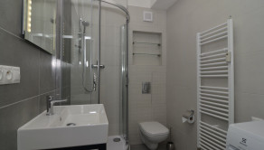 Murované bytové jadro, kde sa nachádza kúpeľňa so sprchovým kútom, umývadlom, WC s geberitom, práčka, obklad, dlažby.