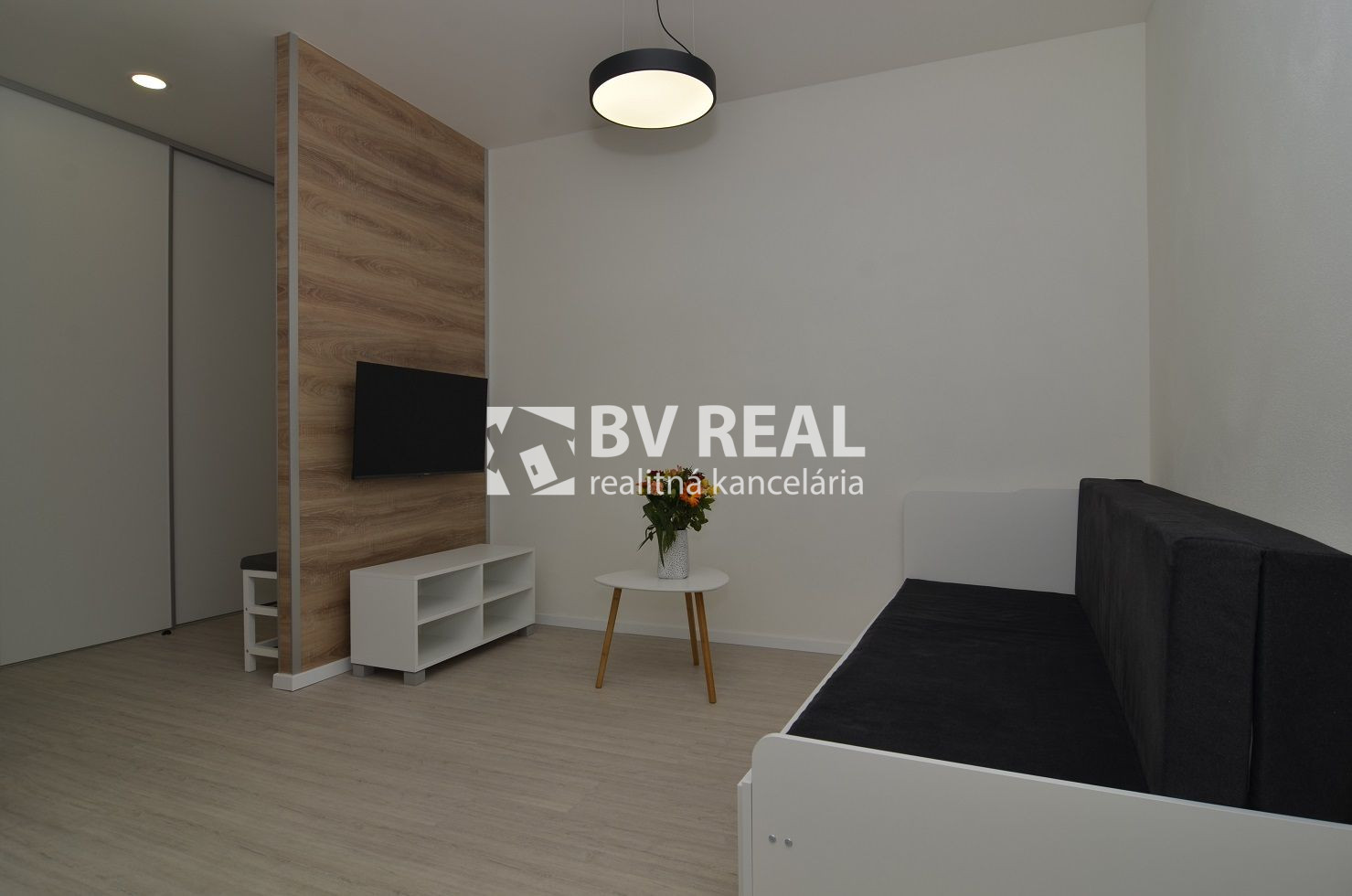 V izbe sa nachádza vstavaná skriňa, TV, rozťahovacia posteľ s drevenými roštami a madracom.