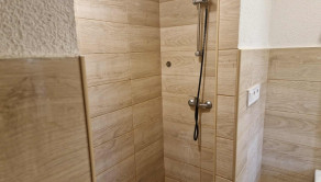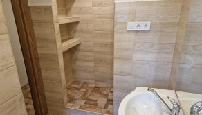 Murované bytové jadro, kde sa nachádza kúpeľňa so sprchovým kútom, umývadlom s kúpeľňovým nábytkom a zrkadlom, s novými dlažbami a obkladmi.